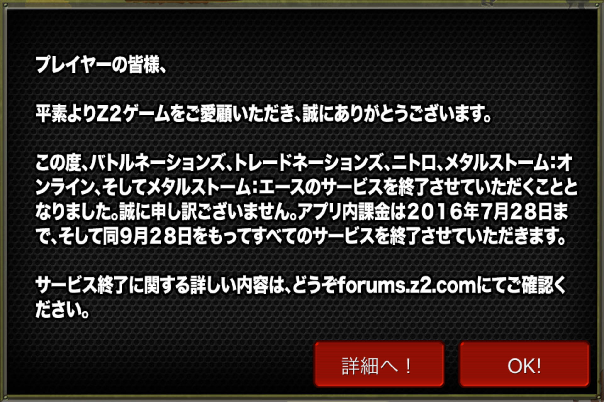 サービス終了 2016/07/29 BattleNationsサービス終了 長らく遊んでいたBattleNationsが終了することとなりました。 いつかは来ると思ってましたが……来ちゃいましたね。運営Z2さんお疲れ様でございました。もともとはMacPC対応のゲームを探していた時にApp Storeで見つけてそこからハマっていきました。一時期海外アニメをよく見ていた私には馴染みやすい絵柄だったっけ。非常に残念です。今まで長い間ゲーム内で交流してくださった方、ブログを見てくださった方ありがとうございました。このブログは消さずに残すつもりです。今後何か用がありましたらメインブログの方でご連絡くださいませ。それではまた会える日まで!