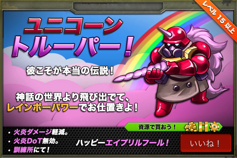 期間限定兵レビュー 2015/04/03 ユニコーン・トルーパー やっと登場しましたね!エイプリルフールということで以前からネット上で存在だけは知られていたユニコーン兵が登場。 メルヘンの世界から飛び出してきたような出で立ち。海外アニメ好きの私としてはどうしてもマイリトルポニーというアニメを連想しちゃいますが影響を受けてるんでしょうかね。■長所:・与えダメージの上限が非常に高い・全ての攻撃(全2種)が対空可能・攻撃範囲が広い・炎攻撃属性の耐久が高い・ナノポッド不要■短所:・与えダメージ量が安定しない