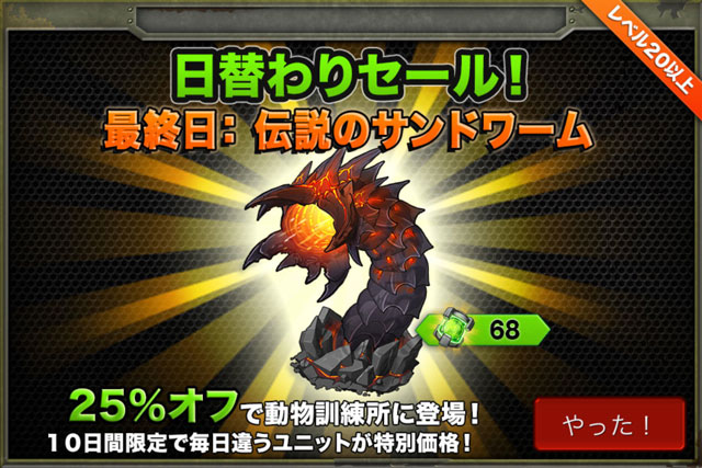 期間限定兵レビュー 2015/06/27 日替わりセール! BNでは日替わりセールを実施中。ちなみにこんなユニット達が出てましたよん。 ■タンククラッシャー:オススメ度:★★☆☆☆未入手のユニットだったので買っちゃいました。特殊な範囲攻撃がやや強め。車両としてはかなり撃たれ弱い部類。コレクションとして買いましたが主力としては使えないかな。 ■レイダー召喚者:オススメ度:★★☆☆☆既に入手済みだったので未購入。ネタ要員(´ω`;)見た目のインパクトが強いのでコレクション用としてオススメ。だってゲタ履いてる丸いおっちゃんだよ。 ■装甲SUV:オススメ度:★★★☆☆既に入手済みだったので未購入。主力としてよく使ってましたが最近になって引退。ボス敵キャラのゴリアテがドロップするファランクスというユニットがこのユニットの上位格として登場するらしいのでちまたでも下火傾向に。 ■さすらいのサムライ:オススメ度:★★★★☆未入手だったユニット。個人的にこのゲームで一番欲しいユニットでした。今となってはもっと強いユニットがたくさんいますが、以前は猛威を振るっていたユニットのひとつですね。単純にカッコいいから欲しかった(´ω`人)■古代偵察機:オススメ度:★☆☆☆☆既に入手済みだったので未購入。残念ながら長所のないハズレのユニット。私の連合ではたこ焼きと呼ばれてました。食べられたらイイのに。■伝説のラプター:オススメ度:★★★★☆既に入手済みだったので未購入。オールラウンダーのアタッカーとして現在でも主力として活躍中。強力で回転率の高い貫通属性攻撃を持ちこれまた強力な打撃属性の対空攻撃を持つのが強み。そこそこの耐久力もありますね。持ってない方にはオススメ! ■ノーマッド:オススメ度:★★★★★既に入手済みだったので未購入。こちらも主力として今でも使ってます。ほぼ全てのDotや状態異常の耐性を持つので後衛としてはかなり耐久力が高い。攻撃面でも高威力の範囲技や凍結攻撃を持っていて強い。複数持っていても良いぐらいオススメです。 ■機甲化歩兵:オススメ度:★★★★★未入手のユニットでした。以前から強いと思ってたのですが見た目がイマイチだったので購入してませんでした(つд`)(※もちろんカッコいいと言ってるかたも沢山おられます)与ダメージ量が多く、使ってて初めて知ったんだけど攻撃が強いワリには回転率がかなり高い。 ■兵器技師オススメ度:★★★☆☆未入手のユニットだったので購入しました。通称『お爺ちゃん』。かなり特殊な攻撃が可能で相手を3ターン(実質2ターン)の間弱体化させられます。PVPでこのユニットが敵側にいるとギョっとしますよね。 ■伝説のサンドワームオススメ度:★★★★★既に入手済みだったので未購入。おそらく現在いる期間限定兵の中では最強。PVP、ボス戦などいろんな場面で活躍できるオススメのユニットです。