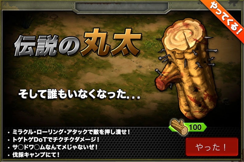 雑記 2015/04/01 伝説の丸太 新たなユニット、『伝説の丸太』の使用レビューです! 長所:・トゲトゲDoTを追加する『ミラクル・ローリング・アタック』が強力・陸上だけでなく、海上戦でも使用可能・非常に高い耐久力を持っている・撃破時SPが多いので派兵に向いている短所:・ビジュアルの好き嫌いは人を選ぶかもまたもバランスブレイカーの登場です。非常に強力なユニットで、伝説のワームの上位版として使用できます。海戦でも使用できますので非常に助かります(´ω`人)※注:この記事を書いたのは4月1日