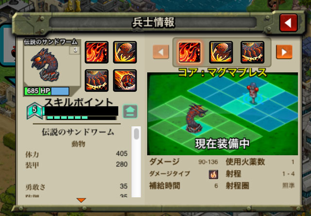 期間限定兵レビュー 2015/01/23 伝説のサンドワーム 個人的にずっと待ち望んでいた伝説のサンドワームが登場しました。 ■長所:・総合的にステータスが高い・従来の伝説シリーズ通り、4種類の攻撃が可能・耐久性が非常に高く、装甲は炎攻撃に対して0倍■短所:・消費ナノポッドが高い(そのぶん強いけど)・氷系の攻撃に弱く、凍結耐性を持たないコメント:久しぶりの、ノーマッド以来の強力な期間限定ユニットです。価格は高いのですが、是非買う事をオススメします!ファランクスを超える体力にはビックリですね。PVPで対戦相手としてこのユニットを見かけた場合の対策は凍らせて叩くというのが一番効率的なのかな。
