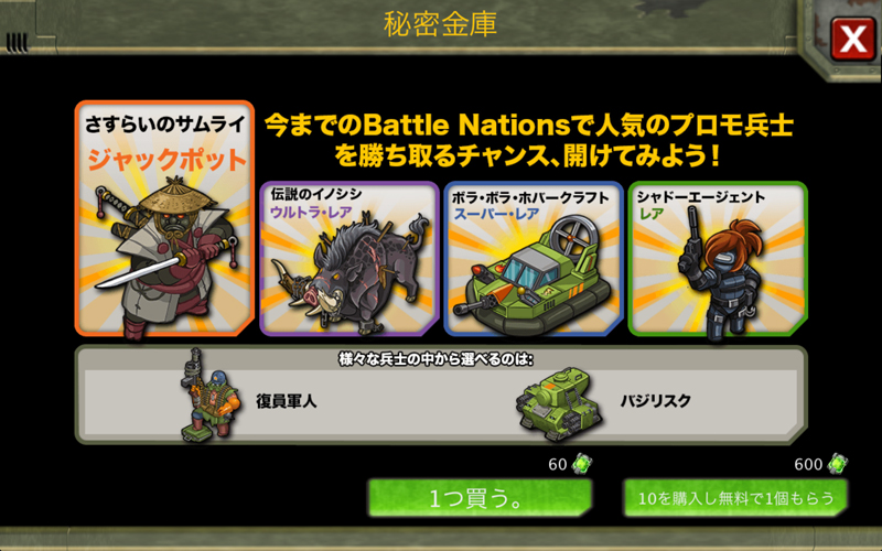 雑記 2014/09/14 秘密金庫 BNに秘密金庫という期間限定イベントがあります。 要するに過去のプレミアムユニットが手に入るガチャらしい。らしい、と言うのも私はガチャ要素が好きではないので秘密金庫をやったことがありません。けどサムライが貰えるとなるとイイナーと思っちゃいます。(サムライは個人的に一番使ってみたいユニット)ボラとバジリスク以外も魅力的です。なのですが……ハズレとしてバジリスクが入ってるんですよね。SUVを持ってる以上、バジリスクは使う機会が全く無いのでやっぱり今回も秘密金庫は見送りですね(´ω`)ハズレてもいいや、と思える内容だったら今後は秘密金庫も手を出してみたいですね。