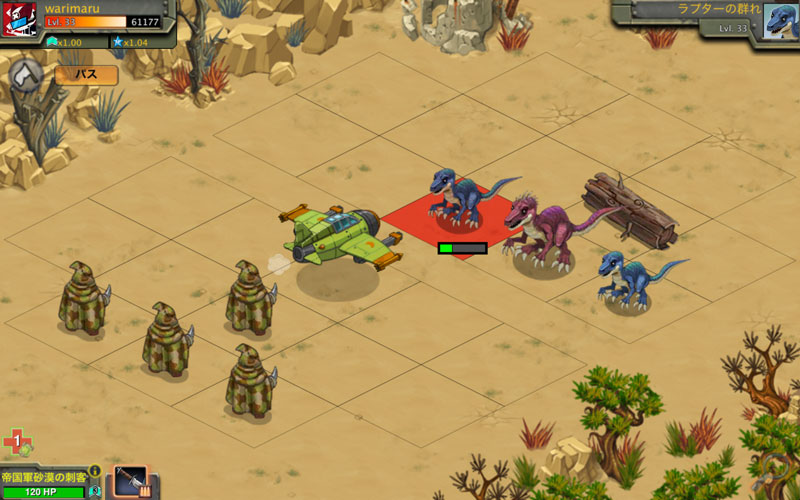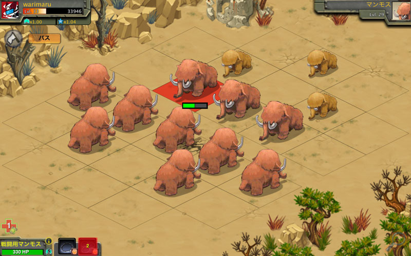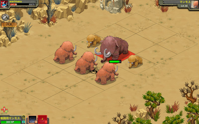 ユニット考察 2014/06/24 マンモス考察 マンモスvsマンモスの図 戦闘中はずーっと『パオーン!』の呼応(つд・) マンモス牧場を手に入れたのでマンモスを育成中です。 まだ手に入れて1日も経ってませんが、使用感などを書いていきます。 マンモスの攻撃は『踏む』と『完全踏みつぶし』の2種類。 どちらも1マス前の敵しか攻撃できませんがイノシシと違って 回転率を調整でき、装甲貫通できる能力もあります。 『踏む』はスタンダードな技。R1だと100前後のダメージを与えられます。 ただし、素早い相手だとはずしやすい。特に理由が無ければこの技を使ってます。 『完全踏みつぶし』は準備に2ターンかかり、バトル開始から3ターン目から使えます。 1度使うと補給に5ターンかかってしまいますが与えるダメージは『踏む』と大体同じです。 しかしこの技は『踏む』と比べると攻撃力が高く相手の攻撃力を下げやすい効果があります。 主に素早い相手に攻撃する時に使ったり確実にトドメを刺したい場合に使用するのでしょう。 戦闘用ラプターや帝国軍イノシシと比較すると攻撃力が低く、 回避も低い傾向がありますが体力が多く、与えダメージも大きく 成長の伸び率が高いです。また、攻撃が2種類あるので他の2体と違って 単調ではないので状況にあわせて有利な技を使っていけるのだと思います。 そして何より、3体の中で一番可愛らしい気がします(´ω`人)