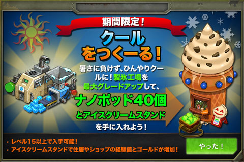 雑記 2014/06/17 クールをつくーる! ※この記事はメインブログから転載したものです ブログの更新が途絶えてますが、最近はFlashゲーム制作と BattleNationsにハマってます。……と言う事で今回はBattleNationsの話題。 一応このゲームを知らない方が読んでも分かるように書いていきます。 梅雨の時期だけの期間限定イベントをこなすと自分の基地になんとも愛らしい アイスクリームスタンドたるものが建てられるようになるそうです。 このイベントをこなす人はだいたいナノポッド(※)目当てだと思うんだけど 個人的にはこのアイスクリームスタンドが欲しい。 (※ナノポッド:お金(リアルマネー)を払うと手に入るゲーム内通貨。) 銃を持った兵隊達が砂漠で繰り広げる殺伐としたゲームと思いきや 自分の基地にお花を植えたりアイスクリームスタンドを設置できたりと お茶目な要素もワリと沢山ありますね(・ω・人) 追記: イベント終了2日前ほどに入手しちゃいました。 ↓こんなかんじ。 集合住宅の中にぽつんと置いてます。 街で評判のソフトクリーム屋さん、みたいな。 ちなみに置くと周囲の建物の性能が上がります。 効果自体もなかなかイイけど範囲も広い。初めてアイスクリームスタンドを 見たときから思ってたのですが将来的にはバナナスタンドという建物が 建てられるので、すぐ横に設置してみたいです。