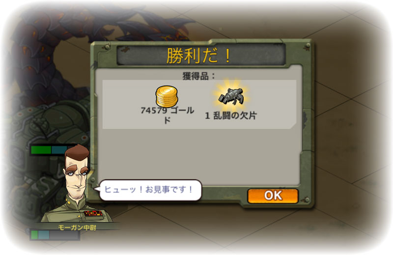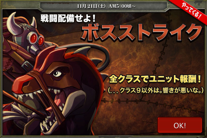 ボスストライク 2015/11/21 ボスストライク20 ボスストライク20!ラプター調教師ユズル!また様子を撮影してみました。※音楽はお遊びで差し替えてます■エフェクト :炎属性攻撃ダメージ増加(炎、毒Dotを含む)■使用ユニット:・伝説のサンドワーム×3(メインアタッカー&壁役)・ファランクス×2(アタッカー&壁役)・歩行戦車×1(アタッカー)・伝説のマンモス×1(スタン&トドメ要員)・戦士蜘蛛蜂×1(アタッカー)・ノーマッド×1(凍結&攻撃補助)・銀狼トラック「天罰」×1(攻撃補助)手持ちユニットは以前より強くなってるのですが、それでも前回と比べると少し難易度が上がってる気がします。理由はやっぱり炎属性ダメージ増加によるもの。サンドワーム類から酸攻撃をまともに食らうと一撃で沈むユニットもいますねー。どうやら戦士蜂が使えるようですが、まだ作りたてでR2へ昇級待ち状態(´ω`;)他にも今回から新たにファランクス、伝マを参戦させることに。今までは持ってなかったんだよね。ファランクスは攻守共に頼れるしマンモスは微妙に体力が残った敵ユニットが複数いても全体技を使って簡単にトドメが刺せるので便利です。報酬のボマー、スカイバス、シャドウワスプ、飛行のかけらは初入手ですね。この調子だとボア2号も入手できそうです。ブログでは書いてなかったですが、実は10月7日に乱闘を手に入れてるので今後活躍してくれるかもしれません。今回は布陣的に出番が無かったね。 車両や飛行のユニットを相手にすると、とっても強い!射程もいつか手に入らないかなー?なんて(´ω`人)