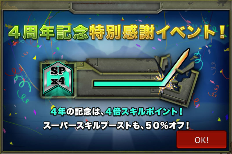 雑記 2015/11/18 4周年記念 SP4倍ボーナスイベント ログインしてみたらこんなイベントが……。 SP4倍!?Σ(°ω° )3倍は見たことあった気がするけど、4倍は初めて見たね。期間は短めでBSが始まるまでには終わってしまう点にはご注意を。ためしに功績消費のSPブースタを使用した状態で蜘蛛蜂の巣で勝利してみると……。 +10,501!