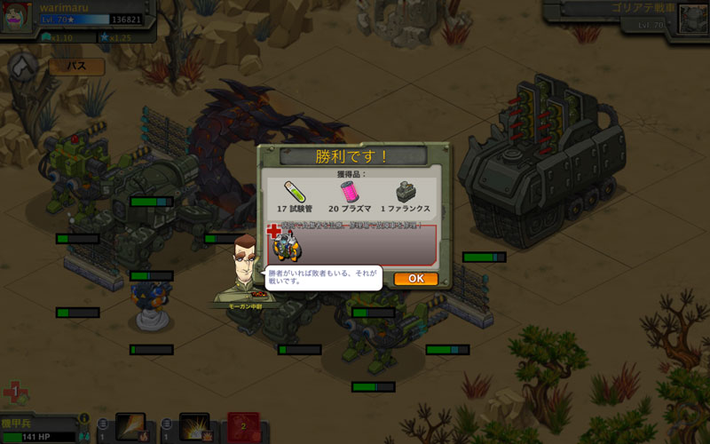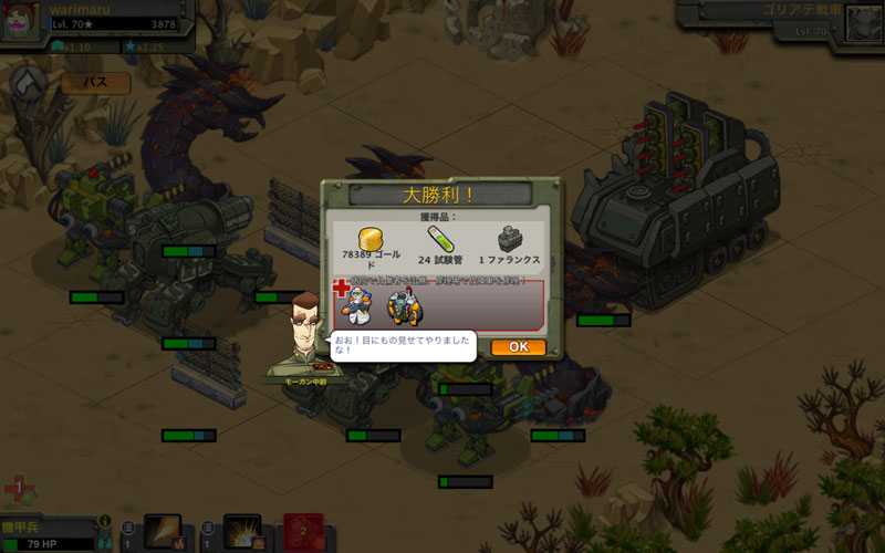雑記 2015/10/01 ファランクス初入手 こないだ、ゴリアテを倒した時のこと ファランクスを初入手しました!強いとは聞いてたけど確かに使ってみるとなかなか使えるヤツです。今では強力なガトリング攻撃の歩行戦車を持ってるので少しありがたさが無くなってしまいますが、それでも十分主力として使えそうなので今後は地道に鍛えていこうかと思います。