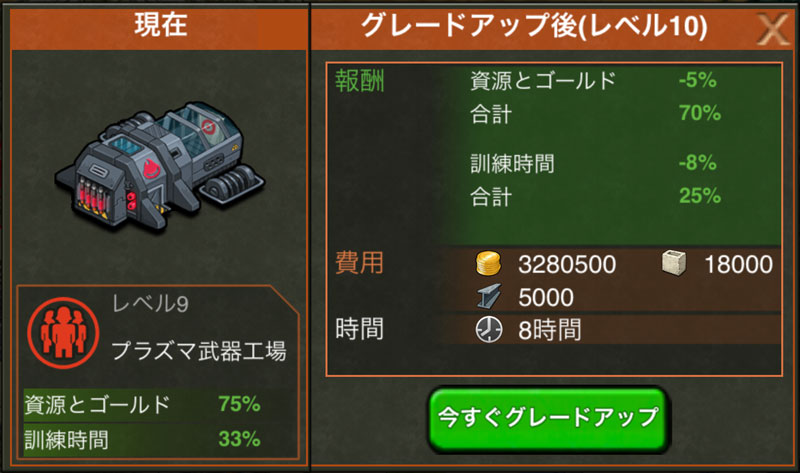 雑記 2015/09/01 プラ武器工LV10 イベントが無い日々(運営さんは旅にでも出てるのかしら)。ついでに資源のコンクリと試験管も無い。現在基地レベルは69。そんな訳で最近はプラズマ武器工場をグレードアップしていってるのですが……。 328万!?すごい金額(°ω°;)必要なコンクリの数もなかなかですね。