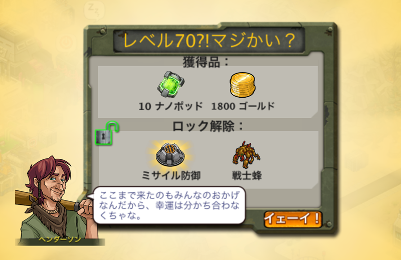 雑記 2015/09/07 基地レベル70突入! ついに基地レベルがカンストしました! 『ここまで来たのもみんなのおかげなんだから、幸運は分かち合わなくちゃな。』とのこと。まだイベントは全て終わってないのでイベントを攻略しつつスターを入手したいですねぇ。プラ砲も入手したばかりで育ててないので次回のBSに向けてランク上げていかないといけません。あとはファランクスとか欲しいですね(´ω`人)卵は別にいらないかな……。