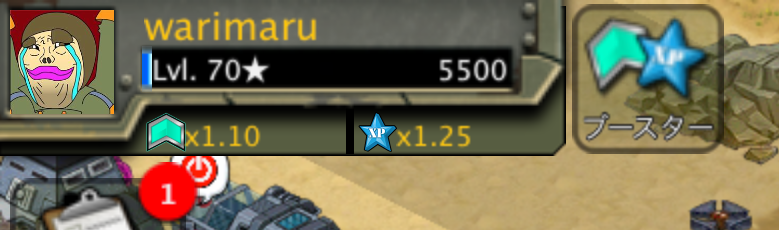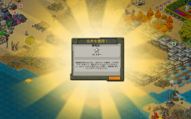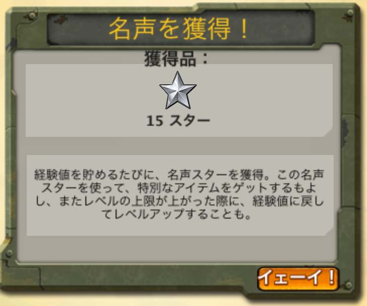 雑記 2015/09/09 初スター入手 基地レベルが70の状態で、経験値バーを最大まで貯めると……。 初のスター入手!正確には既にスターはクエスト報酬で入手してたのですがカンストしないと確実に手に入らないんですよね。噂ではカンストしてなくても寒冷地帯の銀狼を倒すと低確率でスターを落とすそうですが真偽不明。 一回に15スターしか貰えないのね。連合の仲間の話では慣れてくると使い道に困るほど余るそうですが最初は名声アカデミーに使おうかと思います。しのびが欲しい(´ω`人) そしてHUDにも変化が。レベル表記の横に★マークが付き、経験値バーも青色になりました。ところでそろそろアバターアイコンを変えたいのですがエラーが出て変更できません……。困った。もうこのアイコン見苦しいからやだよ(つд・)