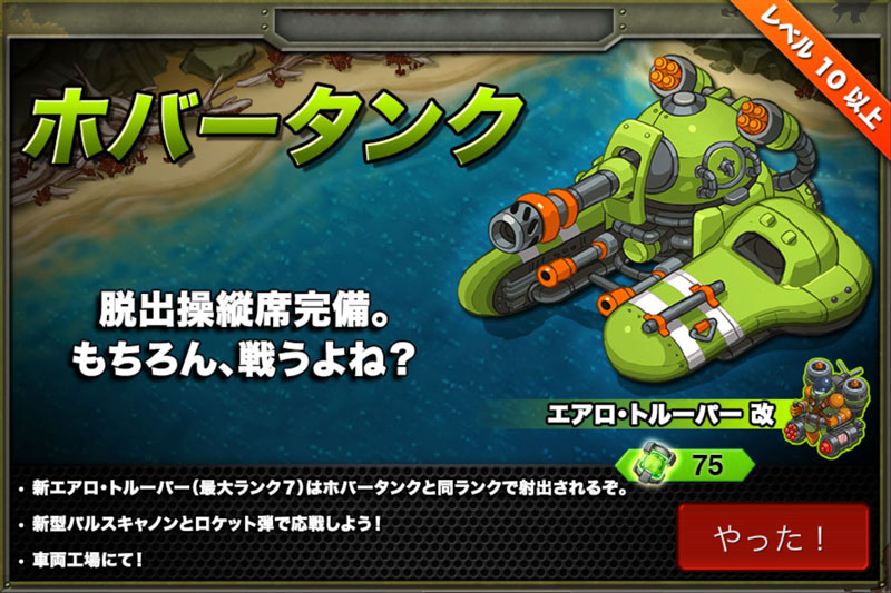 期間限定兵レビュー 2015/06/02 ホバータンク ボスストライク18と同時に期間限定兵が出現!地震Dotを無効化する、その名もホバータンク。 ■長所:・デススポーン※が可能・魚雷属性の攻撃を受けても完全に無効化(0倍)できる・地震Dot無効 ※体力が0になると別のユニットへ変身する新たなシステム。 このユニットではエアロ・トルーパーに変身できますが オマケ程度だと思ったほうが良さそうです。■短所:・デススポーン可能な点以外は器用貧乏 (壁としては脆く、アタッカーとしては火力不足)・回転率が低い短所に壁としては脆いと書いてますが、海戦だと魚雷属性の攻撃を無効化できるので使えるかも。今後地震Dotが存在する地形が増えれば活躍場面が増えるかもしれません。今回のBS報酬のガンシップといい、スターウォーズのような近未来系なユニットが増えて嬉しいです(´ω`人)
