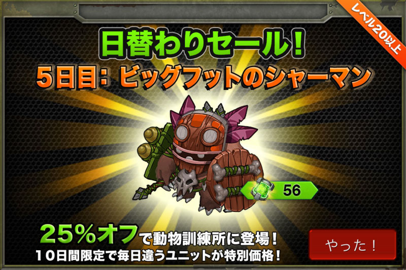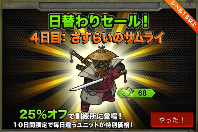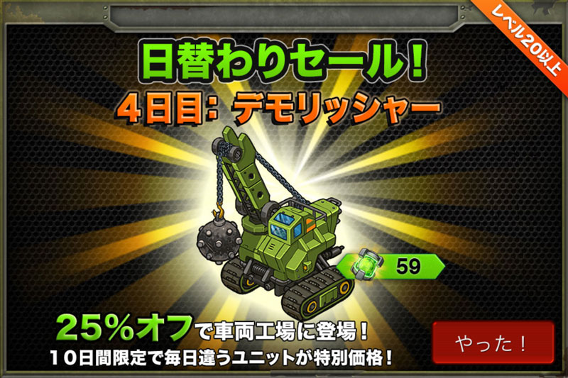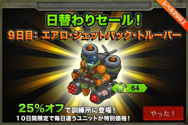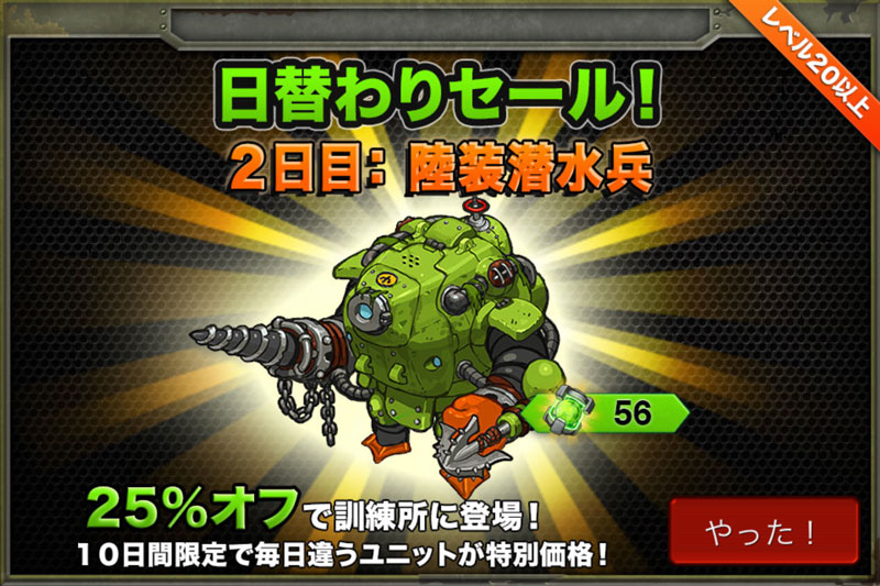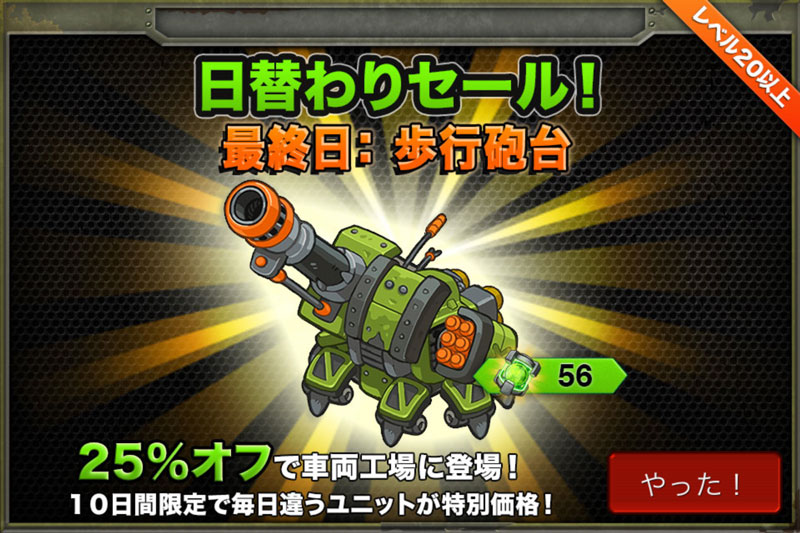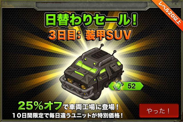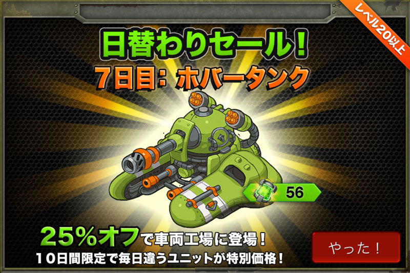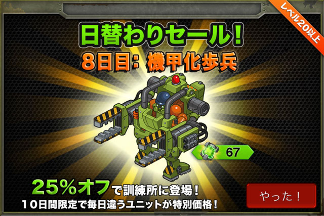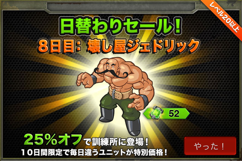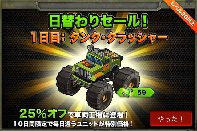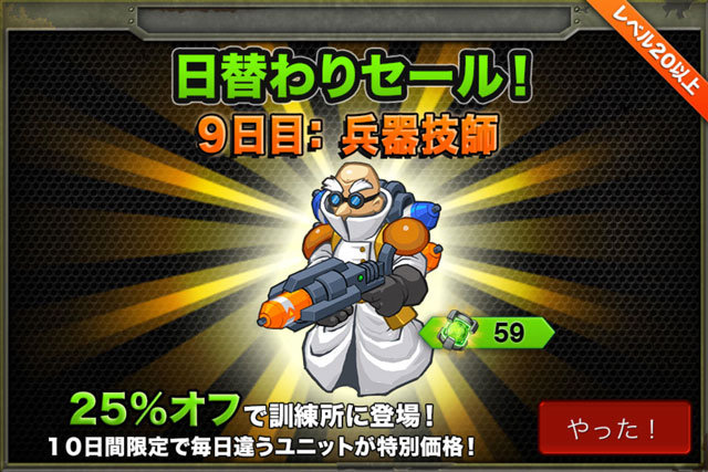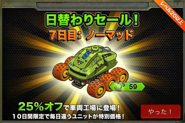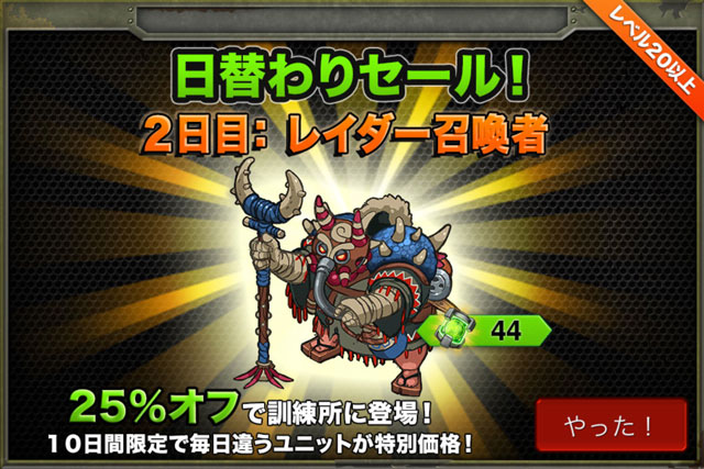 期間限定兵レビュー 2015/06/27 日替わりセール! BNでは日替わりセールを実施中。ちなみにこんなユニット達が出てましたよん。 ■タンククラッシャー:オススメ度:★★☆☆☆未入手のユニットだったので買っちゃいました。特殊な範囲攻撃がやや強め。車両としてはかなり撃たれ弱い部類。コレクションとして買いましたが主力としては使えないかな。 ■レイダー召喚者:オススメ度:★★☆☆☆既に入手済みだったので未購入。ネタ要員(´ω`;)見た目のインパクトが強いのでコレクション用としてオススメ。だってゲタ履いてる丸いおっちゃんだよ。 ■装甲SUV:オススメ度:★★★☆☆既に入手済みだったので未購入。主力としてよく使ってましたが最近になって引退。ボス敵キャラのゴリアテがドロップするファランクスというユニットがこのユニットの上位格として登場するらしいのでちまたでも下火傾向に。 ■さすらいのサムライ:オススメ度:★★★★☆未入手だったユニット。個人的にこのゲームで一番欲しいユニットでした。今となってはもっと強いユニットがたくさんいますが、以前は猛威を振るっていたユニットのひとつですね。単純にカッコいいから欲しかった(´ω`人)■古代偵察機:オススメ度:★☆☆☆☆既に入手済みだったので未購入。残念ながら長所のないハズレのユニット。私の連合ではたこ焼きと呼ばれてました。食べられたらイイのに。■伝説のラプター:オススメ度:★★★★☆既に入手済みだったので未購入。オールラウンダーのアタッカーとして現在でも主力として活躍中。強力で回転率の高い貫通属性攻撃を持ちこれまた強力な打撃属性の対空攻撃を持つのが強み。そこそこの耐久力もありますね。持ってない方にはオススメ! ■ノーマッド:オススメ度:★★★★★既に入手済みだったので未購入。こちらも主力として今でも使ってます。ほぼ全てのDotや状態異常の耐性を持つので後衛としてはかなり耐久力が高い。攻撃面でも高威力の範囲技や凍結攻撃を持っていて強い。複数持っていても良いぐらいオススメです。 ■機甲化歩兵:オススメ度:★★★★★未入手のユニットでした。以前から強いと思ってたのですが見た目がイマイチだったので購入してませんでした(つд`)(※もちろんカッコいいと言ってるかたも沢山おられます)与ダメージ量が多く、使ってて初めて知ったんだけど攻撃が強いワリには回転率がかなり高い。 ■兵器技師オススメ度:★★★☆☆未入手のユニットだったので購入しました。通称『お爺ちゃん』。かなり特殊な攻撃が可能で相手を3ターン(実質2ターン)の間弱体化させられます。PVPでこのユニットが敵側にいるとギョっとしますよね。 ■伝説のサンドワームオススメ度:★★★★★既に入手済みだったので未購入。おそらく現在いる期間限定兵の中では最強。PVP、ボス戦などいろんな場面で活躍できるオススメのユニットです。