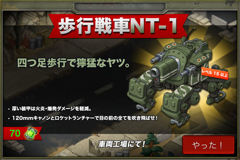 期間限定兵レビュー 2015/09/19 歩行戦車 シュローのBS始まりましたね!それと同時に期間限定兵が登場したのでご紹介します。 ■特徴・1つ目の技は『120mmキャノン(強力砲弾)』。 第一線射程のターゲッティング攻撃で、50%の確率で実験弾ステート付与。・2つ目の技は『120mmキャノン(トリプルショット)』 間接射程のターゲッティング攻撃。縦1列へ攻撃。対空可。 1つめの技とは別スロットなので弾薬に関してはご安心を。・3つ目の技は『ロケット発射台(ヘビーファイア)』 第一線で前面の敵を薙ぎ払う。こちらも対空可。■長所・そこそこの耐久力を持つ・3つの技のうち2つが対空可・全体的に与ダメージ量が多い・スタン耐性を持つ■短所・ヘビーファイアの攻撃範囲を考慮すると 配置する場所がある程度制限されてしまう総評すると間違いなく強いユニットです。攻撃の種類を見た感じではSUVと似ている感じがしますね。ただしSUVのように広範囲にわたって薙ぎ払うことは出来ませんがファランクスのように一定の範囲を強力な与ダメージで薙ぎ払う事が可能です。