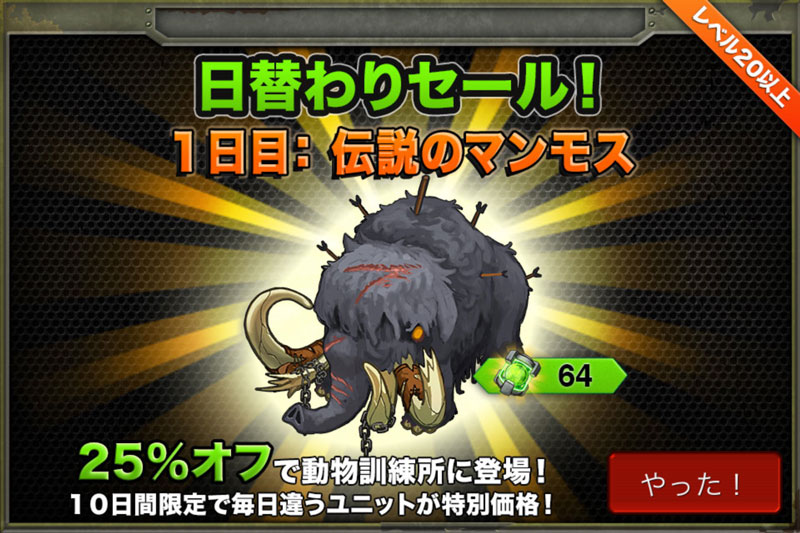 期間限定兵レビュー 2015/10/29 日替わりセール第二弾!前編(1~5日) 日替わりセールがふたたび始まりましたね!随時このブログでも更新していきます。 ■伝説のマンモス:オススメ度:★★★☆☆未入手のユニットだったのでコレクション用に購入。かつては一世を風靡した伝説シリーズ最初のユニット。気絶、毒Dot、極寒Dot、凍結の4つの耐性を持つ。実際に使用してみると浅く広く攻撃するイメージが強い。地上へ全体攻撃が可能な「かなきり声」が特徴的で、R5からは強化版である「わめき声」が25ナノポッドで習得可能となる。このわめき声はスタン率が30%から60%に上がったモノだけど、その他の性能は変わらない。「破壊的な足踏み」は物理攻撃っぽいけどなぜか弾薬制の攻撃。ピンポイント攻撃向きであるこの攻撃と、広範囲向けの攻撃の「重い踏みつけ」がある。他にも対空向けの攻撃、丸太無げも存在する。なぜか育つのが異様に早く、R6までは1時間一律で昇級が可能。食べ盛りなのか。今ではもっと強いユニット(ノーマッド、伝説のサンドワーム、歩行戦車など)が登場して出番が少なくなった。 つづきはこちら