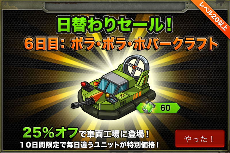 期間限定兵レビュー 2015/11/01 日替わりセール第二弾!後編(6~10日) 記事が長いので前編と後編にわけました。前半はこちら。 ■ボラ・ボラ・ホバークラフトオススメ度:★☆☆☆☆未入手だったのでコレクション用に購入。訓練時間は少し長め。炎Dot、疫病Dot、地震Dotの3つの耐性を持つ。海戦システムが存在しなかった2014年2月に初登場しているものの陸上と海戦の両方に出撃できる。射程や乱闘のように車両ながら貫通属性が弱点という珍しいユニット。エアクッションの部分って銃で撃たれたら破れそうだもんね。前面の3×2マスを貫通属性攻撃で一掃する「スプレー」、対兵士&動物向けで大きく十字型に攻撃する「焼夷弾矢ロケット」、対車両&対空向けで大きくX字型に攻撃する「電磁気パルス・ロケット」の3つの攻撃を持つ。全体的に一度に大勢の敵を狙ったモノが多い。残念ながら総合的に見るとかなり弱いかな。(しかも地味に高い……!)よほどな理由がない限り購入はオススメできません。シャーマンにも言えることなのですが、どちらか言うと過去にあったイベント、秘密金庫(←いわゆるガチャ)でのハズレ要員の印象が強いですね(´ω` ) つづきはこちら