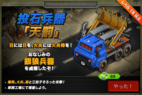 期間限定兵レビュー 2014/12/20 投石兵器「天罰」 現在BattleNationsでは『アリーナ・チャレンジ』たる期間限定イベントをやってるようです。内容は連合軍内で非同期のPVPでたくさん勝つと、景品がもらえるイベントです。そこで登場したのが銀狼の投石兵器。 ■特徴:・完全に後衛ユニット。射程が長いので最背面に配置しても ほぼ自由自在の位置に攻撃が可能。・『全手榴弾』『オイルドラム缶』『有毒樽』の3種類の技を持つ・「全手榴弾」は準備ターンなしで、強力なチェッカー攻撃が可能。 対戦相手のユニット配置とマッチングした場合は、これを利用して 1ターン目から大ダメージを与えたり相手の装甲を剥くことができる。・「有毒樽」は「オイルドラム缶」の毒バージョン。ただし 以下の違いがある ・与ダメージが大きい ・Dotダメージは4ターン続く。(オイルは3ターン) ・飛行ユニット LTAユニットを狙う事ができない ↑※(間違えてました。ゴメンなさい……。)■長所・すべての技が間接攻撃なので、常に後衛を狙える・基本的に相手のどのマスにも攻撃が可能・「全手榴弾」はチェッカー攻撃のワリにクリティカルがやや高め■短所・見た目に反して、飛行ユニットには対抗しづらい・相手とこちらのマス目が横1列しか残っていない場合は ほぼ対応ができず、一方的に攻撃を受けることになる