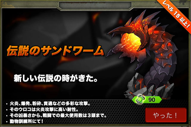 期間限定兵レビュー 2015/01/23 伝説のサンドワーム 個人的にずっと待ち望んでいた伝説のサンドワームが登場しました。 ■長所:・総合的にステータスが高い・従来の伝説シリーズ通り、4種類の攻撃が可能・耐久性が非常に高く、装甲は炎攻撃に対して0倍■短所:・消費ナノポッドが高い(そのぶん強いけど)・氷系の攻撃に弱く、凍結耐性を持たないコメント:久しぶりの、ノーマッド以来の強力な期間限定ユニットです。価格は高いのですが、是非買う事をオススメします!ファランクスを超える体力にはビックリですね。PVPで対戦相手としてこのユニットを見かけた場合の対策は凍らせて叩くというのが一番効率的なのかな。