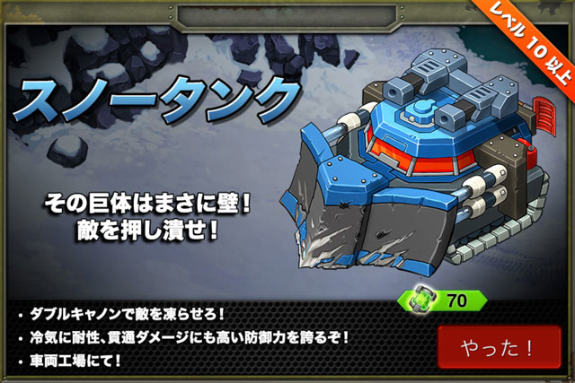 期間限定兵レビュー 2015/02/09 スノータンク BS期間中に新たなユニットが現れました。 ■長所:・寒冷耐性を持っている・敵を凍らせる事が可能・見た目通り総合的な耐久性は高い・攻撃範囲がどれも特殊なので 微妙にHPが残ってしまった敵のトドメを刺すのが得意・回転率がやや高い ■短所:・凍結は100%ではない上に、攻撃範囲が特殊なので 攻撃面では安定性に欠ける私のレベル(54)だと今回のBSでは重宝しました(´ω`人)